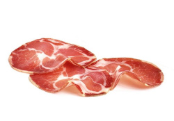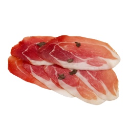 Насладитесь тонкими ломтиками нежной сыровяленой ветчины, выдержанной в соли и ароматной смеси специй: розовый и чёрный перец, тимьян, чеснок, пропитаны утончённым вкусом бальзамического уксуса.